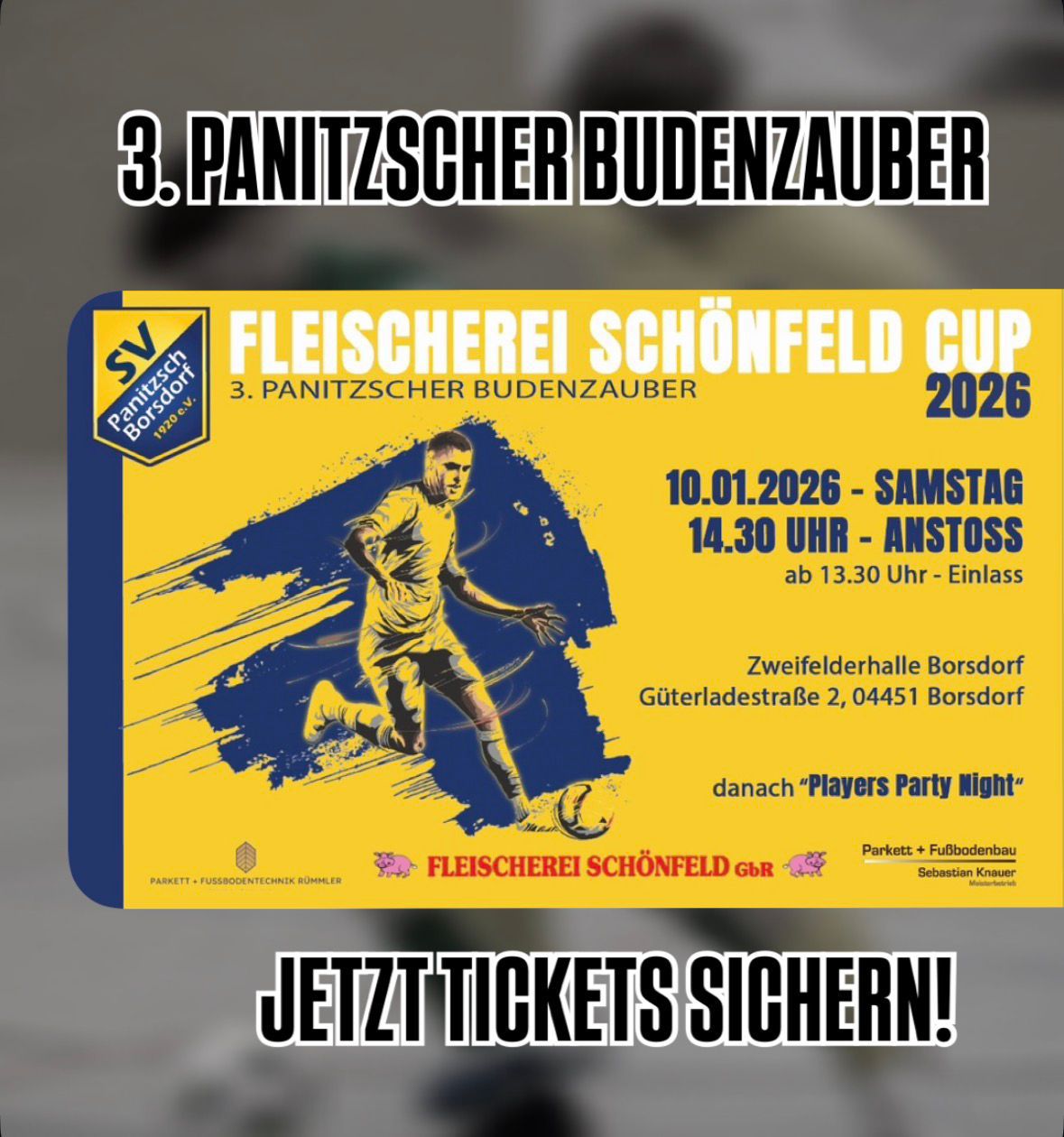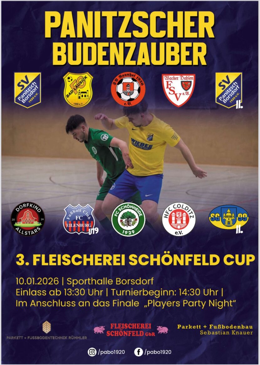 Der “Fleischerei Schönfeld Cup“ macht auch 2026 wieder den Auftakt ins neue, blau-gelbe PaBo-Fußballjahr. Auch dieses Mal ist es gelungen, ein attraktives Teilnehmerfeld zusammenzustellen. Im neuen Modus mit zehn statt acht Teams, wird zunächst die Vorrunde in zwei 5er-Gruppen ausgespielt. Anschließend werden in Viertel- und Halbfinalspielen die beiden Endspielgegner ermittelt. Ihr dürft euch also auf noch mehr spannende Spiele unterm Borsdorfer Hallendach freuen!